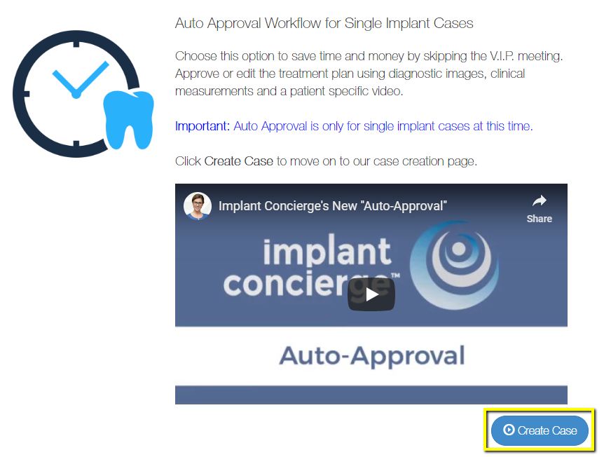 2.  For Implant Concierge to create your treatment plan with the Auto Approval workflow, select the blue “Create a Case” button.
