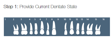 4.  Fill out the tooth chart on the left (Current Dentate State) to reflect the patient’s dentition at the time of the scan.  Click on a tooth once to designate it as “missing”. Click on the tooth a second time to show a dotted line around the tooth, meaning it will be extracted at the time of surgery.  Clicking the tooth a third time places the tooth back on the chart.